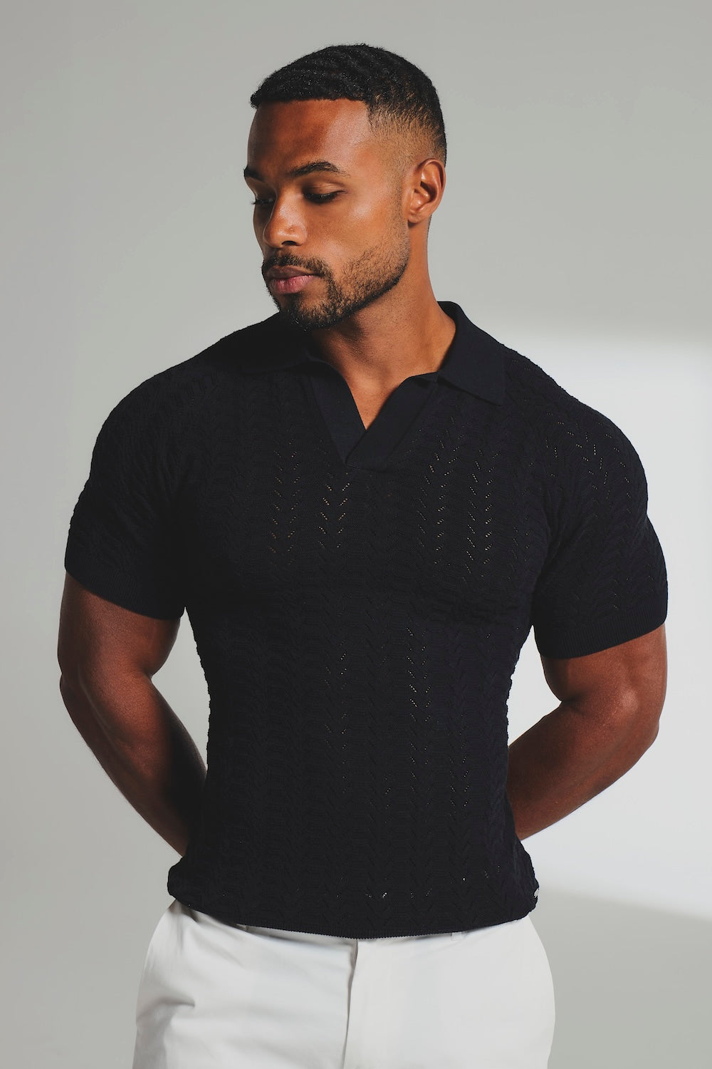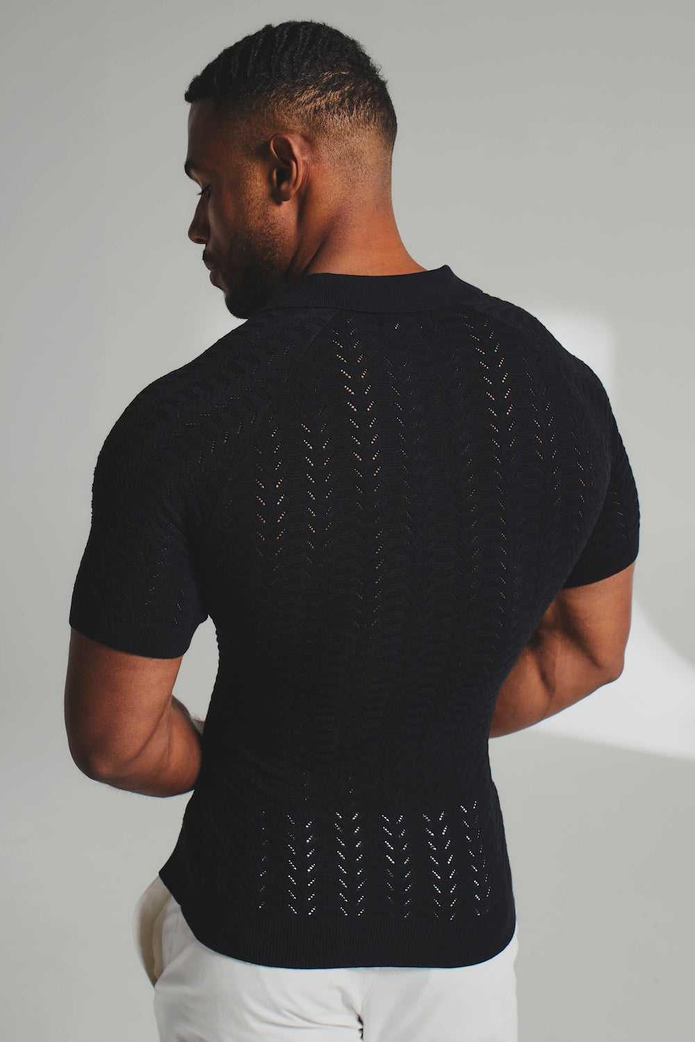 Finally—a polo designed for warm days and easy wear. Designed for men with broader shoulders and a narrower waist, this Muscle Fit polo enhances the chest and arms while tapering neatly through the body. The pointelle knit construction keeps it breathable and lightweight, while the open collar adds a relaxed, modern feel. Raglan sleeves allow natural movement while subtly enhancing the arms.