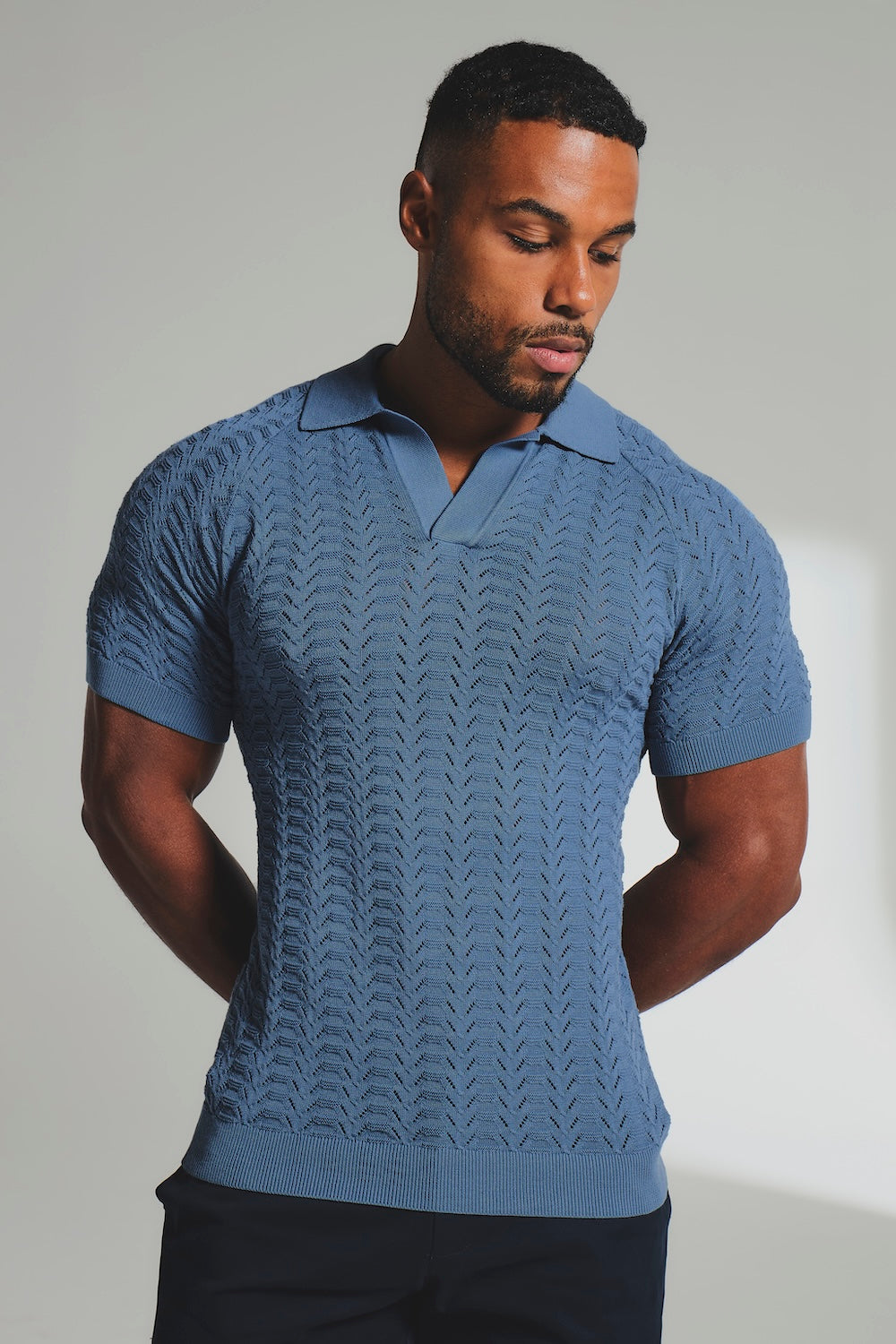 Pointelle Knitted Open Collar Polo Shirt in Blue