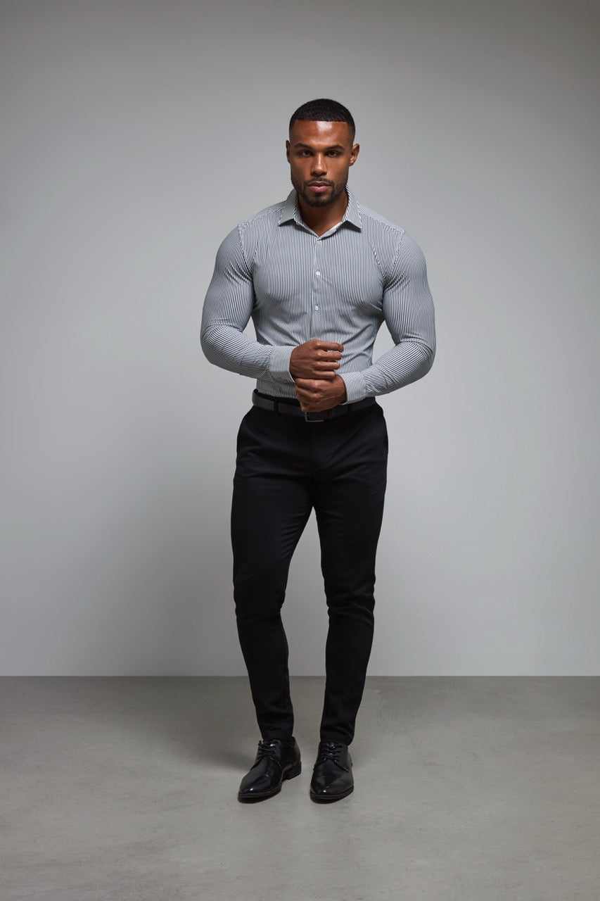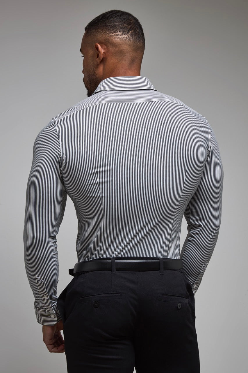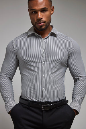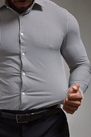 Elevate your office wardrobe with the Striped Stretch Formal Shirt. Featuring a sophisticated cutaway collar and fine stripe design, it exudes understated elegance.This shirt boasts a crease-free, wrinkle-resistant finish—perfect for all-day wear. The True Muscle Fit enhances your physique, comfortably shaping your muscles and defining your chest for a tailored look. Minimal stitching ensures a refined, classy aesthetic that transitions seamlessly from desk to dinner.
