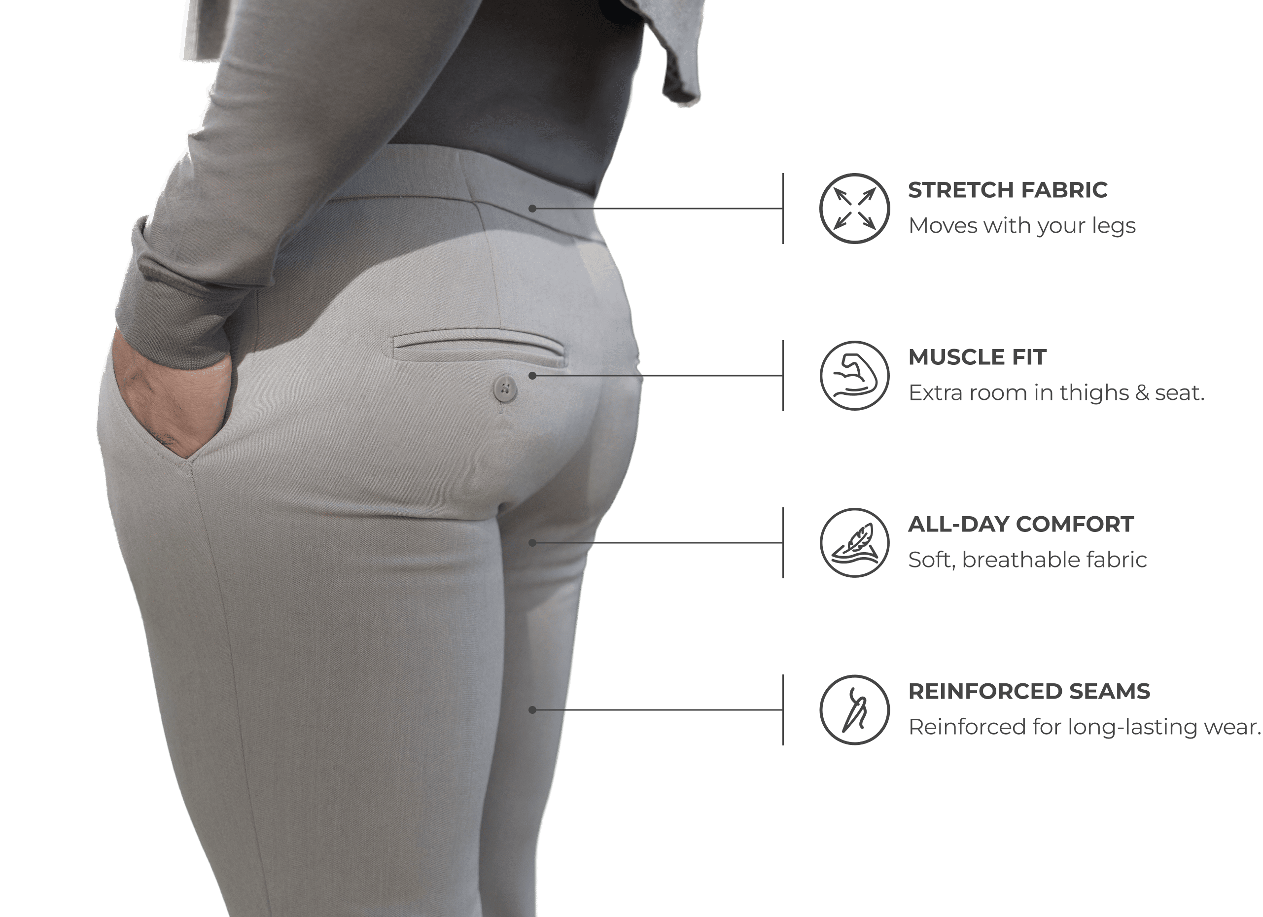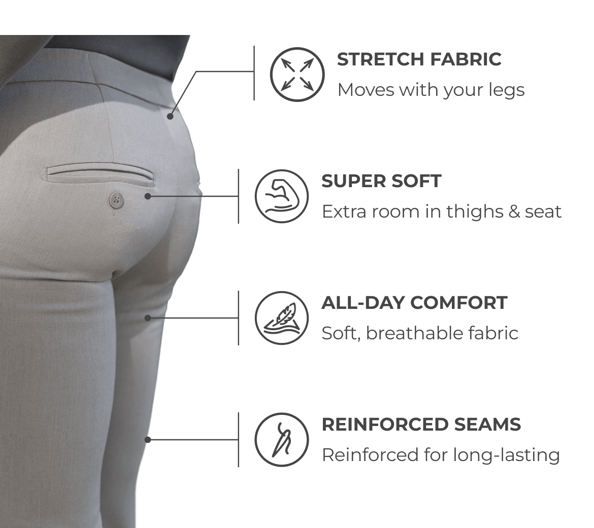 Extra room in the seat and thighs, tapered from knee to ankle. Stretch performance fabrics and reinforced seams for all-day comfort and durability. No baggy waist. No tight thighs. No compromises.